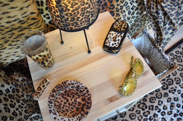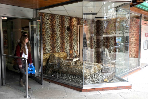 A room furnished with found leopard skin objects was installed in an empty retail unit at the back of Castle Mall Shopping Centre, Norwich.