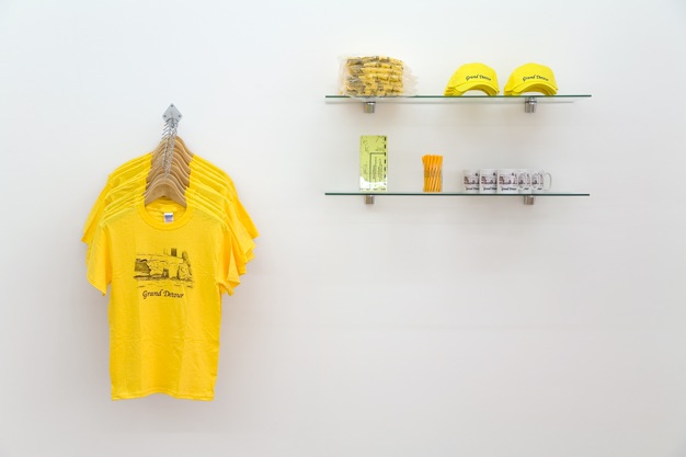Pencil and watercolour on paper, painted wall with pencil grid; T-shirts, caps, mugs, pens, glass shelving, wall fixtures. Installation Dims. Variable.