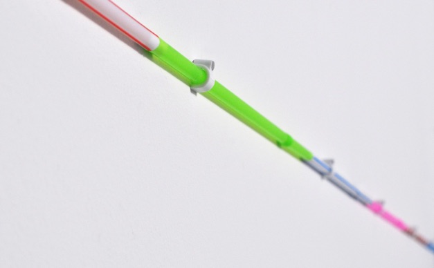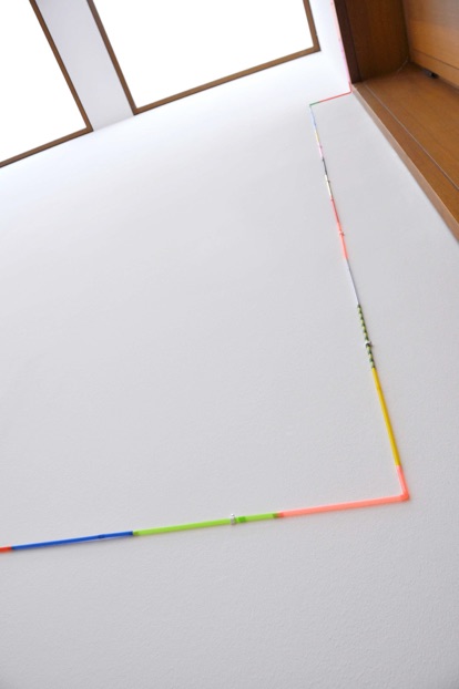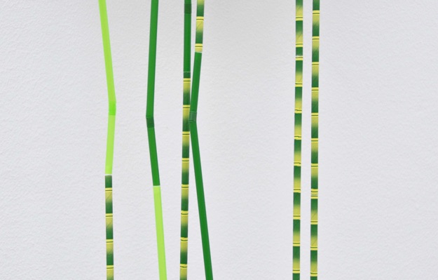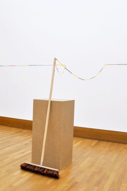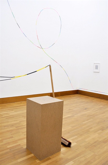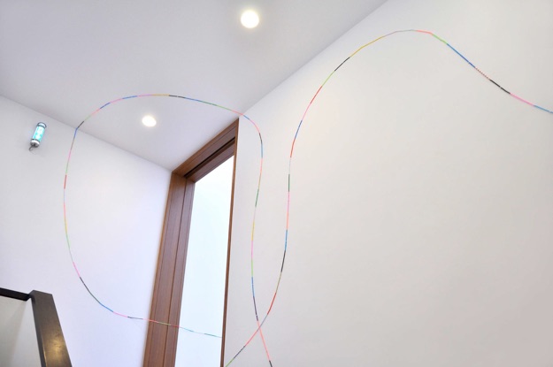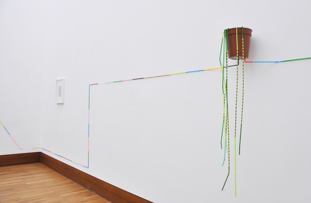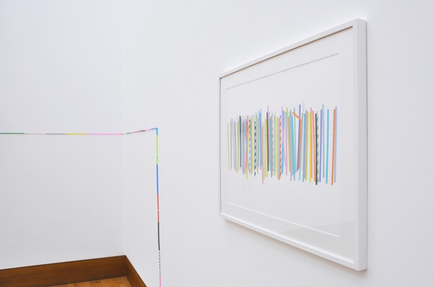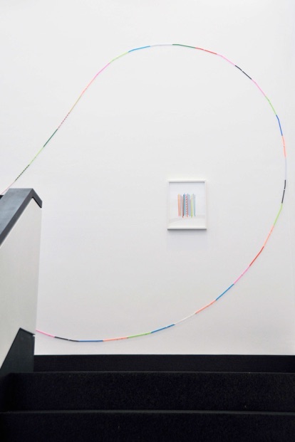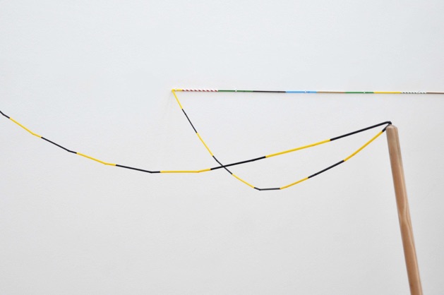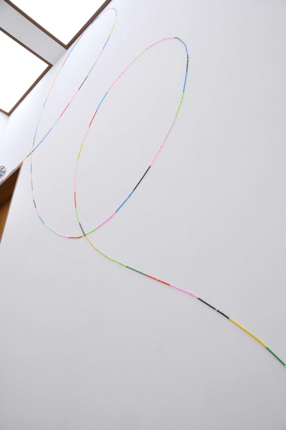 A line drawing constructed from drinking straws circumvents the gallery space. It follows its own logic with precise efficiency, taking in occasional swirls and detours as it explores the architecture of the space.